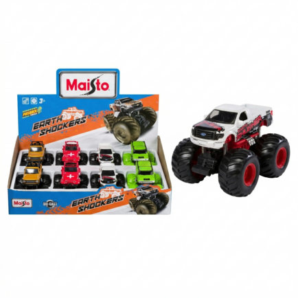 Maisto Earth Shockers monster truck toys measure 4.5 inches and feature a free-wheel design with functioning doors. Comes in 4 vibrant colors, including orange, red, white, and green colors. Some also have unique decals. Wheels are either black or lime green and may also have white lettering on the sides. Each monster truck is friction powered with a pull-back mechanism. Designed with the highest quality die-cast metal and plastic materials for extremely durable play. Get 8 Earth Shockers with a blue, orange, and white display box.