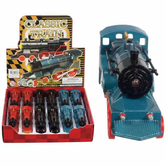 Pull back this 5" die-cast train to see it chug along. Push the button to add flashing lights and realistic train noises. Non-replaceable batteries. Assorted colours. 3yr+