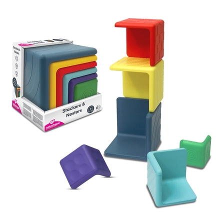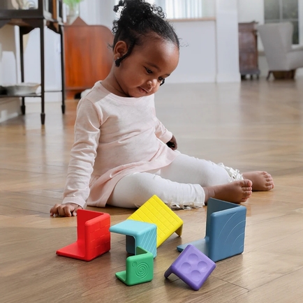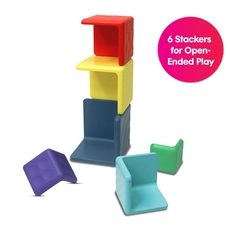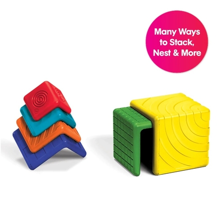Rotated one way, pieces nestle into each other; rotated the other way, they stack into a cubic shape. Little ones will love these colorful textured shapes. Great for open-ended play, sensory development, cognitive, and motor skills!