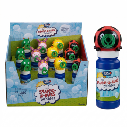 A mini Squee-Z-Bub is combined with a 4 oz. bottle of bubbles to create this cute, bubbling combo. Assorted ladybug, blowfish, caterpillar and butterfly. 3yr+