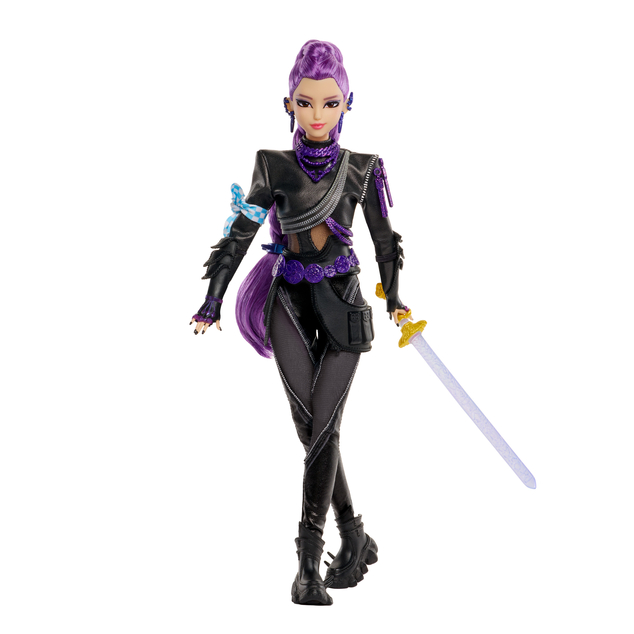 Battle Rumi doll comes with 11 posable joints, a shimmering Four Tiger Sword accessory, her iconic purple braid and a fierce smoky eye