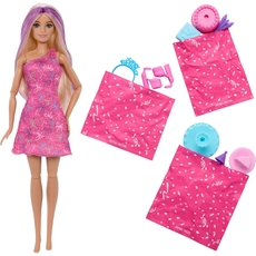 With 12 surprises in one package, Barbie Rise & Surprise doll delivers a unique reveal experience with gift box-inspired packaging and pet birthday-themed fun! Open the present and watch as Barbie pops out of the stack! The slide pops out next – surprise! Pet puppy is ready for a ride! Surprise bags reveal even more fun with party fashions, dress-up accessories and sweet party treats. More surprises include color-change on the doll's hair -- simply use icy cold and warm water to transform, change back and repeat again and again! Join the party with Barbie Rise & Surprise doll. Each doll sold separately, subject to availability. Dolls cannot stand alone. Colors and decorations may vary.