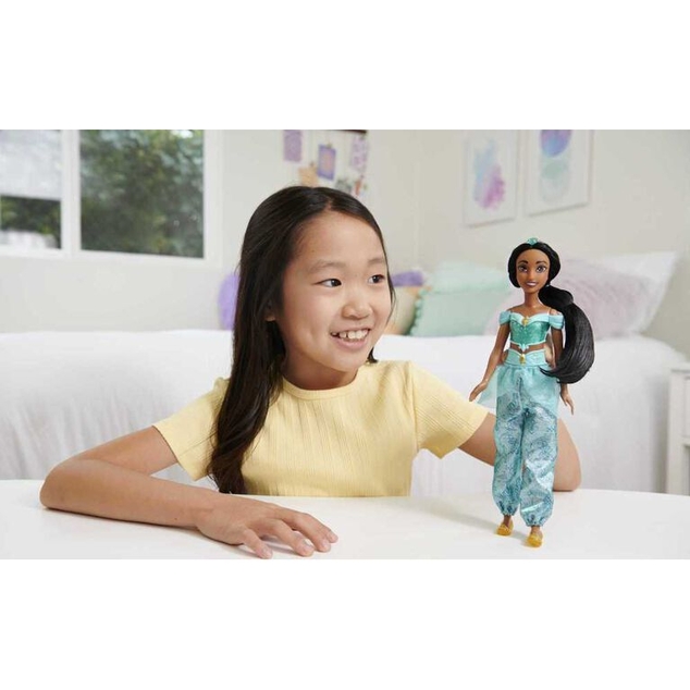 Meet this Princess Jasmine doll, inspired by the generous and daring heroine from Disney's Aladdin. This posable fashion doll is shown in a sparkling outfit and accessories that include shoes and a tiara. In her signature look from the movie, this Jasmine doll is ready for any adventure! Doll cannot stand alone. Colors and decorations may vary.