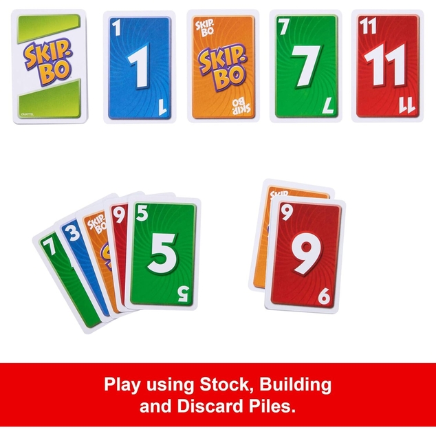 Skip-Bo is the ultimate sequencing card game from the makers of UNO! Players use skill and strategy to create stacks of sequentially numbered, ascending cards (2,3,4…) until they have no more left to play. Once everyone is dealt their own personal stockpile of cards, play begins by drawing from a central pile and building up to four “build” piles. The Skip-Bo “wild” cards break up static situations and may be played as any number. Use these cards wisely, for they can really help you beat your opponents! The first player to deplete all of his or her Skip-Bo stockpile cards is the winner! Includes 162 cards and instructions. Colors and decorations may vary.