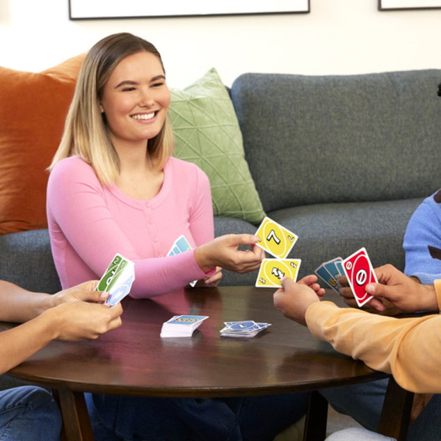 UNO Teams is the classic game you know and love, now played in teams of two. Players work together to match colours, numbers, and symbols
