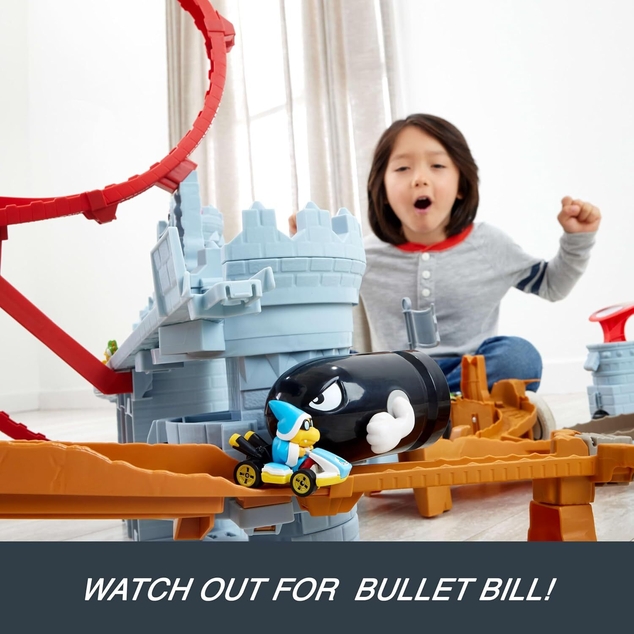Race and stunt through the Hot Wheels Mario Kart Bowser's Castle Track Set with a 1:64 scale die-cast Kamek! This massive playset features interactive racing with loops, a slam launcher and a rogue Bullet Bill who swoops through, trying to knock Kamek off the track. There's room to store more than 30 vehicles when they're not in play, put them on display! A first-appearance die-cast Kamek is included; additional vehicles sold separately. The set also folds for easy storage. Colors and decorations may vary.
