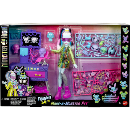 Help Frankie Stein doll dream up cute creatures with the Monster High Make-A-Monster Pet lab! Building a one-of-a-kind pet is as easy as 1, 2, 3 -- just choose a base body, then mix and match the 30+ included pieces to bring the custom creation to un-life! After building scare-dorable pets, use the lab table and nurturing accessories to care for them and play the day away. With countless combos to choose from, this Monster High playset makes a creative and fun gift for kids 4 years and up! Doll cannot stand alone. Colors and decorations may vary.