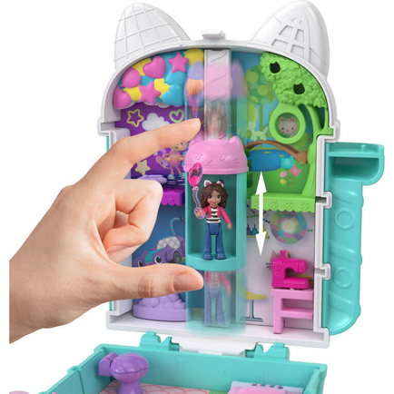 It's a purr-fect day to play! Gabby's Dollhouse and Polly Pocket join together to create the ultimate party playset. The adorable compact is shaped like Gabby's Dollhouse with a fun glitter shaker feature on the roof. Gabby and her three kitty friends are ready to paw-ty! Inside, explore moving features like a cat-a-vator that slides to visit each room, a banner that drops down in the party room, a vanity, and a bed that flips up to reveal surprises! Ideal for ages four years old and up. Colors and decorations may vary.