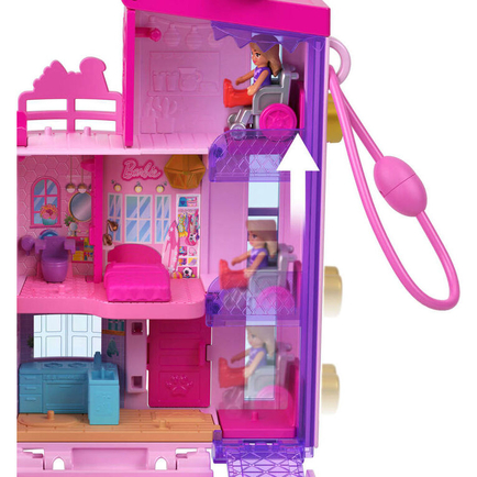 Polly Pocket and Barbie come together in this perfectly pink compact that resembles the iconic Barbie Dreamhouse in micro Polly Pocket form! The dollhouse playset comes complete with three micro dolls, one pet puppy, and 11 accessories, including a wheelchair. Inside the mini Dreamhouse, kids can fold open the roof to reveal a slide, take a ride in the wheelchair accessible elevator, or check out the bookcase that opens to a bed. Barbie, Brooklyn, and friend love to zoom down the slide and make a splash in the Barbie pool -- cannon ball! Makes a great gift for ages 4 years old and up, especially those who love both Polly Pocket and Barbie! Colors and decorations may vary.