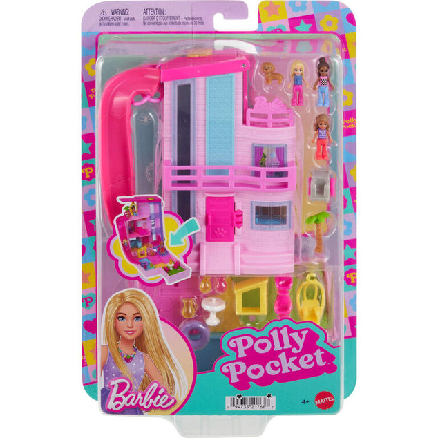 Polly Pocket doll goes to Barbie-land -- this partnership compact captures the Barbie Dreamhouse in adorable micro form for play or display!