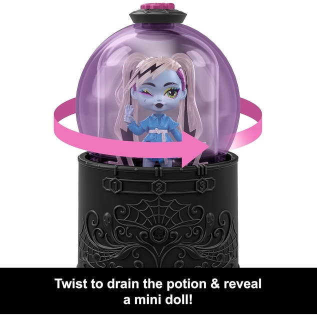 Now it's time to see which ghoul will materialize. Twist the crystal ball to watch the 'magic' potion vanish and reveal the fright sized doll inside!