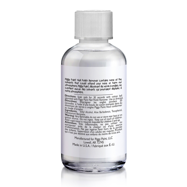 Warning: Because Piggy Paint Nail Polish Remover is flammable when heated, do not use or store near heat or an ignition source. Do not ingest. Keep out of reach of children, and always have an adult supervising while using this product.