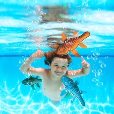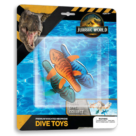 Soft, weighted neoprene dive toys designed for underwater play. Featuring Jurassic Park colors and graphics, this 3-pack adds dino favorites to pool games and swim practice, while the flexible material offers a comfortable grip.