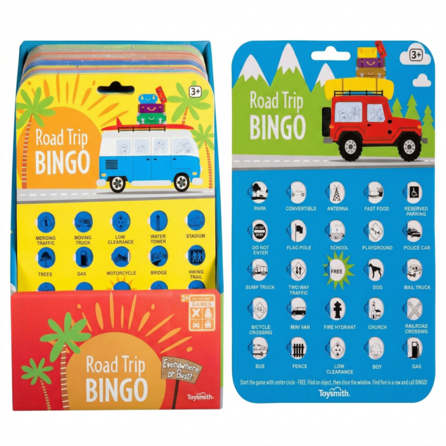 Toysmith’s Road Trip Bingo Game is available in 4 road-trip-inspired illustrations including desert, beach, city and mountains. Cards are either red, yellow, green, or blue with road-trip and environmental drawings. Each card holds 24 unique slots with one free spot in the middle. Slide the windows closed to mark a spot. An assortment of 72 sets come in a 6.89 x 7.28-inch multi-colored display case.