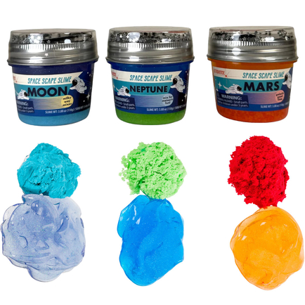 Space Scape Slime comes in a 3 x 2.75-inch jar with a resealable top. Each one contains 3.88 ounces of slime in two different colors. Available in 3 styles including Moon, Mars, and Neptune. Each space putty is a mix of two colors, including green, orange, purple, and/or blue, and includes a collection of sparkling star confetti in silver, purple, or black. Each slime putty also comes with a tiny packet of scientific facts about the Moon, Mars, or Neptune.