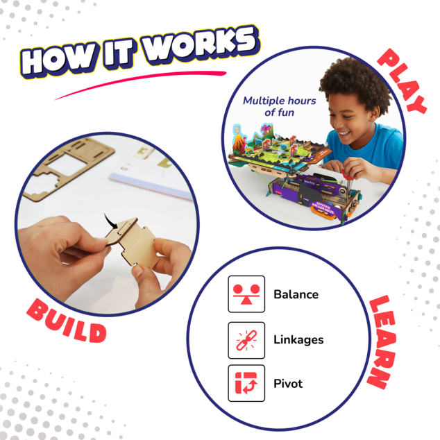 But wait, there's more to this madcap marvel. It's not just about navigating through thrilling game boards – it's a science extravaganza! Unleash the power of levers and linkages, bounce around with elasticity, decode the secrets of gravity, and explore equilibrium in the quirkiest way possible. Your kids won't just play; they'll learn the science behind the game, making this the coolest fusion of fun and education.