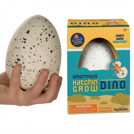 From Toysmith’s Hatchin’ Grow collection comes the popular Ginormous Hatchin’ Grow Dino Egg. Each 4.5-inch speckled egg comes in its own colorful box and dissolves in water to reveal 1 of 4 assorted dinosaurs inside. Submerge egg in water for 48: 72 hours to dissolve. Assorted dinosaurs include a T. rex, parasaurolophus, triceratops, and stegosaurus. Pack quantity includes 8 individually boxed dino egg water-grow toys.