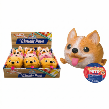 Skwishy Pets Dogs measure 4.5 inches in diameter and have rotund spherical bodies. These squish balls come in 4 brightly colored dog styles. Each one has protruding tiny feet, giant black and white eyes, a black nose, and either pointed or folded ears. Choose the brown Pug, beige and pink French Bulldog, orange and white Corgi, or the yellow Labrador Retriever. A Farm Fresh display box holds 12 assorted pups.