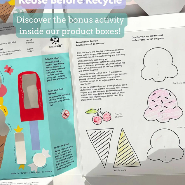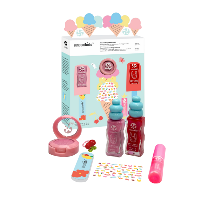 Make dress up extra fun with this new Ice Cream Cone Play Makeup Kit. Safe, Fun & Easy. The all natural lip gloss is made from vegetable oils and beeswax, safe, glossy and hydrating. Suncoatkids makes playtime mess-free, worry-free- Just Paint, Peel and Repeat!