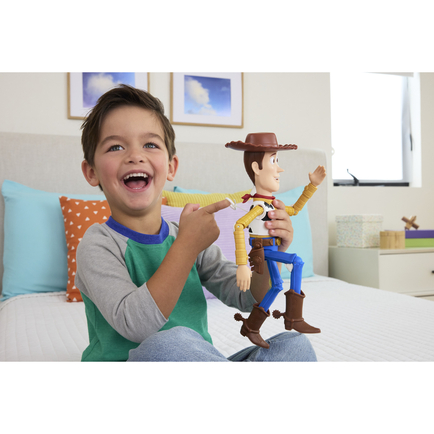 Large scale! Woody stands 12.25 inches tall. He's designed at 12-inch scale, a larger size that's easy to handle. "At scale" means he's accurate in size to other figures as they appear on screen.
