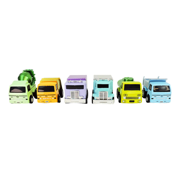 This assortment includes six unique metallic truck styles, adding variety and collectibility to every play session. Whether racing across the floor or setting up pretend worksite adventures, each truck brings its own personality and play value.