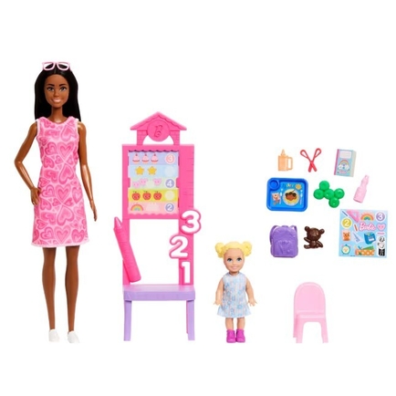 Imaginations can explore a world of teaching and classroom fun with the Barbie Careers Teacher playset! This themed set features Barbie Teacher doll, an adorable toddler student, a classroom setup with a teaching board and chair and themed accessories. Kids can use the included sticker sheet and pieces to play out lessons with role-play fun. With endless possibilities for school storytelling, the Barbie Teacher set lets kids lead the class and dream big! Doll cannot stand alone. Colors and decorations may vary.