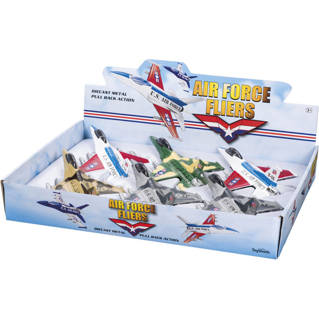 This 7" military jet has a pull-back motor and opening cockpit. Assorted colors. Age: 5yr+ Case Pack: 6