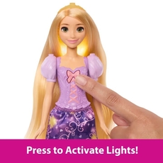 With five ways to glow, Disney Princess Magical Rapunzel doll makes playtime shine bright! Inspired by the heroine from Disney's Tangled, Rapunzel doll's hair lights up when kids brush it just like in the movie! Kids can press the doll's headband or bow button to activate multicolored lights, or they can attach Rapunzel doll's chameleon friend Pascal and her tiara to the headband for even more glowing fun. With styling accessories like a hair extension and hair clips, kids can create dazzling hairstyles and let their creativity glow! Doll cannot stand alone. Colors and decorations may vary.