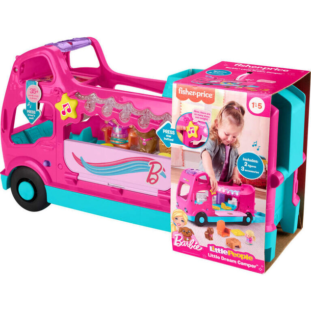 Toddlers can embark on Barbie-themed camping adventures with this musical push-along RV that opens into an interactive Little People® playset