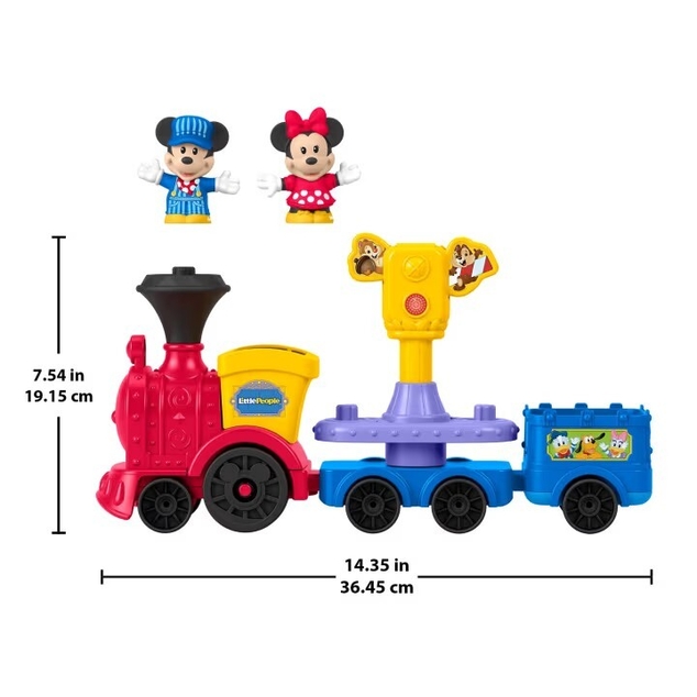 Toddlers can imagine endless adventures with their favorite DISNEY Jr friends, Mickey and Minnie Mouse, with this Little People musical toy train from Fisher-Price. This push-along toy train features fun music and sounds, a passenger car with spinning seats, a pop-up traffic light, and 2 Little People figures styled like DISNEY Jr characters Mickey and Minnie. Kids will love sending Mickey and Minnie rolling along on all sorts of musical journeys! Look for additional Little People figures featuring DISNEY Jr characters to bring to the Mickey & Minnie Musical Train for more ride-along play! Requires 2 AA batteries (included). Colors and decorations may vary.