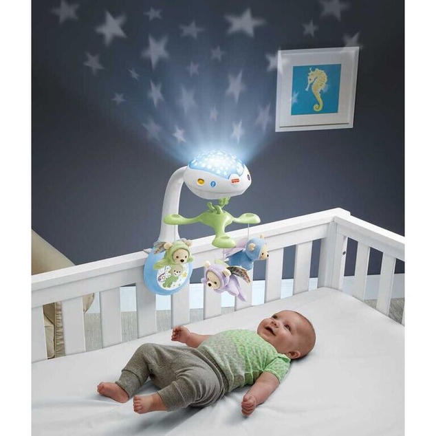 The Butterfly Dreams 3-in-1 Projection Mobile from Fisher-Price helps soothe and comfort your baby from newborn to toddler. Newborns can gaze up at the motorized crib mobile with starry light show projection and three soothing musical settings. As your baby gets older, remove the mobile and convert the music and light unit to a tabletop projection soother to help maintain that hard-won bedtime routine. You can even link the mobile to your stroller canopy for entertaining on the go! This product may not attach to all crib designs.
