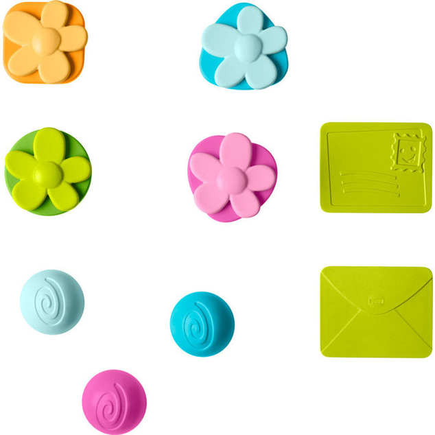 Comes with 3 balls to drop through the rain spout, 4 shape-sorting flowers, and 2 mail play pieces to slot through the door