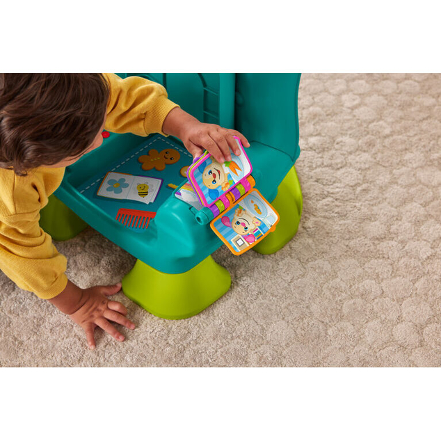The Laugh & Learn Smart Stages Chair from Fisher-Price is your baby's very own spot to get cozy, play and discover. The interactive seat knows when little ones sit down or stand up, so the chair can respond with fun songs & phrases! As they take a seat, babies and toddlers have lots of fun activities to explore, including a light-up remote with number & shape buttons, a flipbook, and a lift-up cushion with hidden surprises. Three Smart Stages learning levels feature 120+ songs, sounds and phrases that introduce colors, shapes, numbers, counting and opposites as kids play. Use the globe button to select a language: English, Spanish, French, or Brazilian Portuguese. (Colors and decorations may vary.)