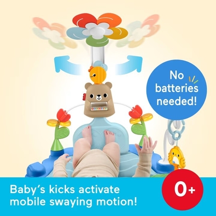 The Fisher-Price 3-in-1 Kick & Sway Activity Gym is packed with engaging sensory play to keep your baby busy with skill-boosting fun from newborn lay & play to tummy time and sit-up play! Baby sets everything in motion with a unique swaying mobile that spins around and bobs back and forth when baby kicks the foot pad. This non-electronic newborn gym features 5 sensory play areas with developmentally appropriate activities for babies to explore, including a bat-at rattle roller and bead bar, plus a deluxe playmat, 3 linkable toys, and a tummy time mirror. No batteries required! Colors and decorations may vary.