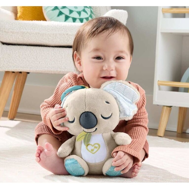 Baby can settle in for comforting cuddles, at home or on the go, with the On-the-Go Koala Soother plush toy from Fisher-Price. Styled like an adorable koala, this customizable portable sound machine plays up to 20 minutes of gentle music, white noise, or shushing sounds to calm your newborn the way they like best. Featuring soft plush fabric, satiny ears, and fun ribbon taggies for sensory exploration, the On-the-Go Koala Soother is an excellent travel companion for your little one. Requires 2 AAA batteries, included. Colors and decorations may vary.