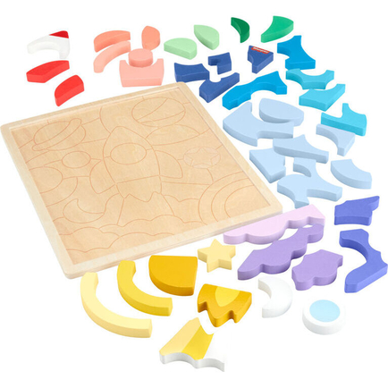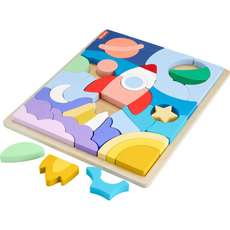 Wooden jigsaw puzzle for kids in fun outer space design with stackable shape blocks