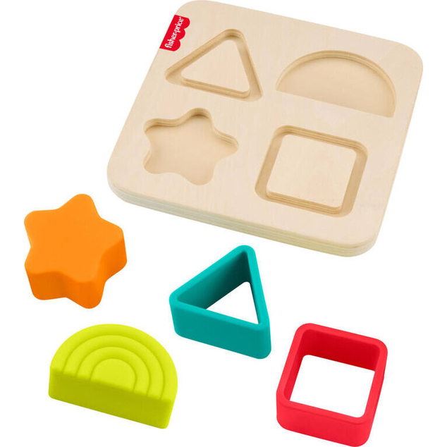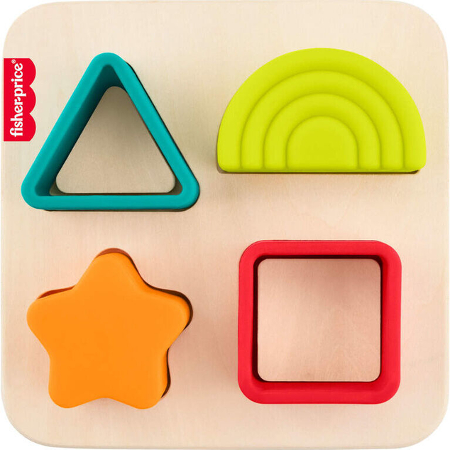 Introduce your baby to colors, shapes and sorting with this Wooden Silicone Puzzle from Fisher-Price. This developmental baby toy includes 4 colorful shapes made from soft silicone, plus a sturdy wooden base made with wood from Forest Stewardship Council-certified sources (FSC-N004566). This engaging shape-sorting toy helps foster sensory and fine motor skills, including dexterity and hand-eye coordination, while helping to develop early problem-solving. Decorated with non-toxic, water-based paints. Colors and decorations may vary.