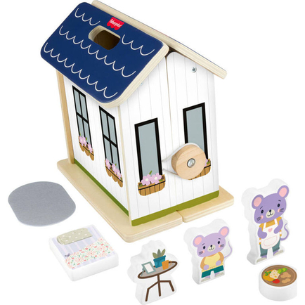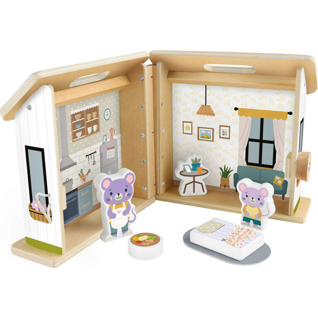 6 play pieces! Includes 2 mouse characters, 2 furniture pieces, 1 food piece, and 1 fabric rug; all pieces fit inside the dollhouse for storage and travel