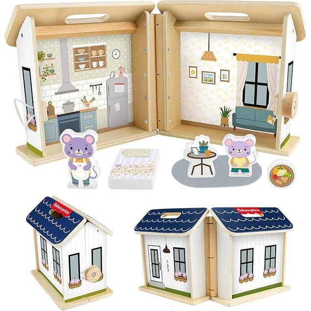 Kids can create fun stories, at home or on the go, with this Wooden On-the-Go Play House from Fisher-Price. This portable playset opens for 360 degrees of play and comes with 6 play pieces, including 2 cute mouse characters, 2 furniture pieces, 1 snack piece, and a soft fabric rug. Made with wood from Forest Stewardship Council-certified sources (FSC-N004566) and decorated inside and out, this travel-friendly dollhouse is sized just right for preschoolers. Pieces store conveniently inside. Colors and decorations may vary.