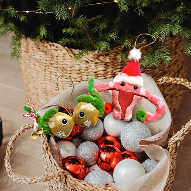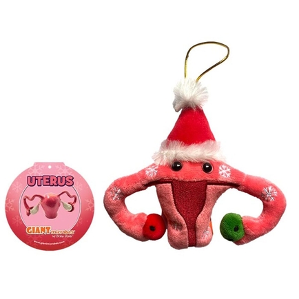 Deck the halls with microbes! Our Uterus ornament is festively dressed up for the holidays! Adorned with embroidered snowflakes, a Christmas hat and red and green ovaries. Includes gold loop for hanging on the tree.
