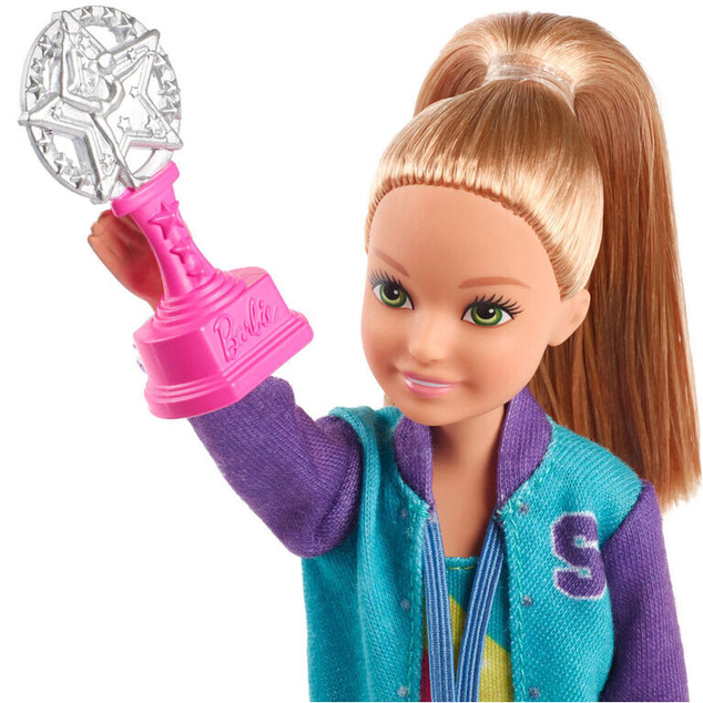 Stacie doll and her friends are go-getters, just like her big sister Barbie doll -and together they make a super-strong team! With Team Stacie, kids are inspired to explore their interests. Young athletes will flip for this Stacie doll and gymnastics playset - the gymnast doll can really spin on the bar! Simply snap her wrists into the clips and turn the crank to see her flip backward or forward. Then play out a floor routine with the ribbon or the two hoops -each has a handle the doll can hold for active role-play fun! Additional accessories help kids really win at playtime; there's a golden medal, a star trophy, a gym bag and towel. Stacie gymnast doll wears a colorful leotard with bold graphic and has a track suit and sneakers for when she's off the mats. Kids will love playing out practice or competition and going for the gold -go Team Stacie! Collect all the Team Stacie dolls and toys for even more possibilities to explore during playtime (each sold separately, subject to availability). Includes Stacie doll with fashions and accessories, spinning bar, two hoops, ribbon, medal, trophy, towel and gym bag. Doll cannot stand alone. Colors and decorations may vary.
