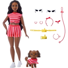 Barbie doll and her puppy perfectly match in wavy red stripes! Barbie wears white sneakers and a two-piece set with a knotted tie detail that is a mirror image of the tie on her puppy's top!