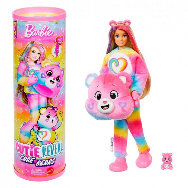 Barbie Cutie Reveal Care Bears dolls offer the cutest wow moments as kids open the package to find 10 surprises! Discover one of three different Care Bears characters in the line's second series -- Togetherness Bear, Dream Bright Bear or Good Vibes Bear. Remove the adorable plush costume to reveal a posable Barbie doll. Which doll will you reveal? Then find more surprises like a skirt, headband, earrings, a pair of boots or shoes, sponge-comb and matching mini–Care Bear! Reverse the plush top for a fleece jacket and flip the costume head for a pet bed. Use water for even more cuteness with repeat color-change transformation on the doll's face! Kids will love discovering -- and collecting -- all the cute surprises in this lovable series. Each doll sold separately, subject to availability. Dolls cannot stand alone. Colors and decorations may vary. Barbie price comparator