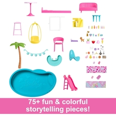 Kids can host the ultimate pool party with the Barbie Dreamhouse! This deluxe doll house has the tallest slide in the Barbie Dreamhouse series to date, with a three-story spiral design for endless fun in the sun. It inspires 360-degree play with a wide and spacious floorplan, three levels, and 10 indoor and outdoor living areas. The playset also features more pet-friendly touches than ever before, including a puppy slide and pool where furry friends can play along with Barbie doll! Plus, the top floor bonus room wows with a sleepover transformation that allows the Dreamhouse™ to sleep four dolls. With 75+ accessories and customizable spaces that double the fun, it makes an exceptional gift for kids ages 3 years old and up. Assembly required. Dolls not included. Colors and decorations may vary.