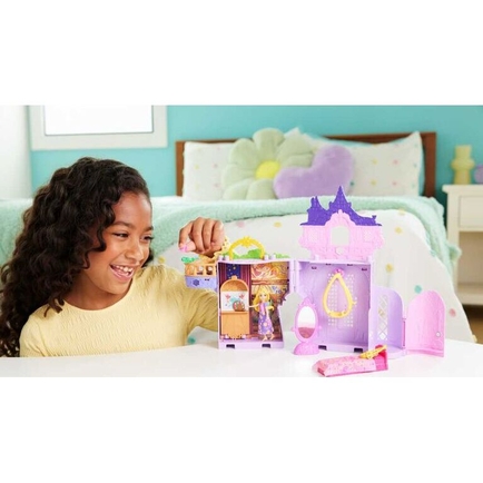 Fans will be delighted with this tower playset, inspired by Disney's Tangled! A doll house in charming small scale, the playset opens to reveal multiple play areas, plus a Rapunzel small doll (3.5 inches), 1 animal friend, furniture and more. Playset includes a handle for on-the-go play and can connect with other Storytime Stackers to expand the fun. Doll cannot stand alone. Colors and decorations may vary. Each set sold separately, subject to availability.