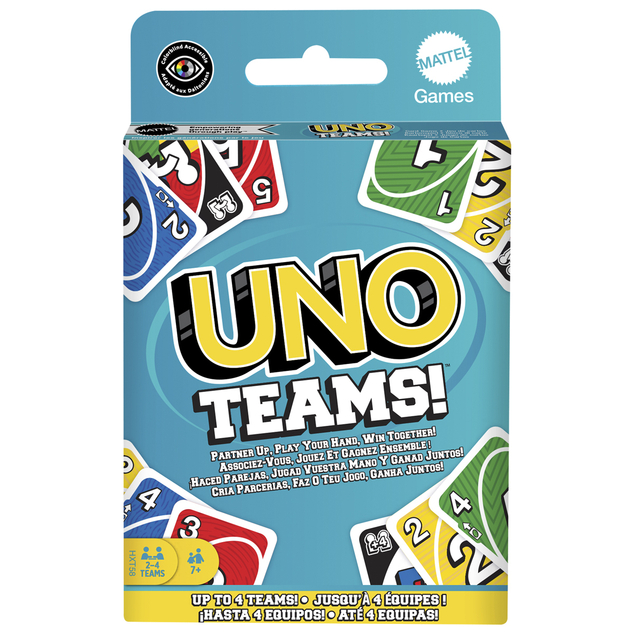 UNO Teams is the classic game you know and love, now played in teams of two. Players work together to match colours, numbers, and symbols