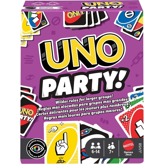 Gather everyone around for the UNO Party Card Game with classic UNO game play, plus extra cards and special rules designed specifically for large groups to keep the party going! Players still match color and numbers just like the classic game, but there are a ton more cards. With up to 14 players in the game, things can get noisy, crazy and wild! This version's rules will have players passing cards until someone can't play, pointing at other players to draw cards and linking two players together who must draw at the same time. There's even a new Speed Play rule. Designed for 6 to 14 players ages 7 years and older, UNO Party is a fun game to bring together families and friends at parties and on game nights! Colors and decorations may vary.
