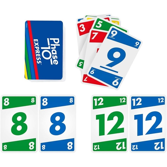 Phase 10 Express offers all the fun of the classic Phase 10 card game but with updated Phases and faster gameplay. Featuring a smaller, more portable deck, Phase 10 Express allows players to finish rounds more quickly! Players race to complete 10 different Phases, such as One Set of 3, One Run of 4, or 4 Odd Cards. Special action cards like "Wild" and "Skip" add to the excitement and can help players get out of sticky situations.