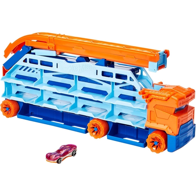 The Hot Wheels City Speed Drop Transport Hauler combines the convenience of a cool-looking Hot Wheels hauler with the awesomeness of a two-foot vertical racetrack that connects to other sets. In transport mode, the big rig semi can hold more than 20 1:64 scale toy cars as it rolls on its six massive wheels. Unhitch the rear lock and transform this hauler into an incredible two-foot-tall track for extreme excitement. Stunt cars down the epic gravity drop that can connect to other sets (additional track sold separately). Includes one Hot Wheels vehicles to haul from the get-go. Colors and decorations may vary. For 22.