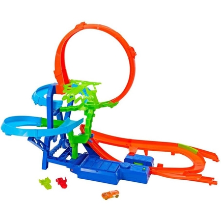 Race, stunt and crash with this Hot Wheels track set that includes a motorized booster and folds for easy storage. Drop in the included Hot Wheels toy car, and it immediately launches into a jump-stunt and loop, followed by another jump and curves before doing it again. Flip the diverter to race off to other challenges. Amp up the thrills by adding more 1:64 scale cars to see how long before there's a mid-air crash. (Additional cars sold separately.) The set has a handle and foldable storage for portability. Colors and decorations may vary.